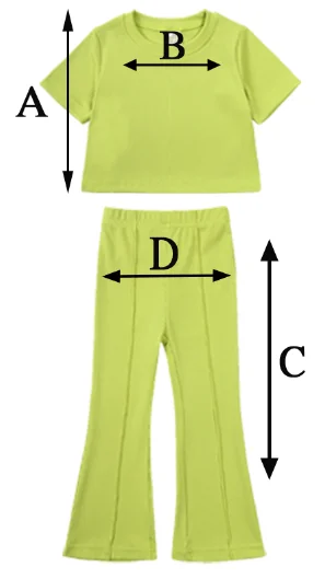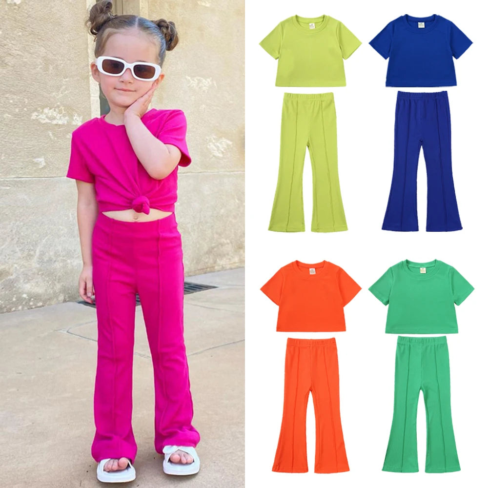 2025 Summer Girls Bell Bottom Outfits 2pcs Solid Cotton T-shirt Pants Suit For Children Teenage Girls Fashion Tracksuit Clothes