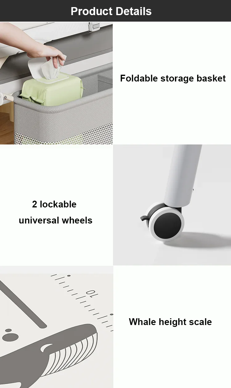 FREE PARENT'S WAIST: The baby changing table with bathtub features four adjustable heights, catering to parents ranging from 4.9 to 6.1 feet tall. The side storage basket and bottom storage shelf provide ample space for storing essentials such as diapers, bath towels, washcloths and toys.
