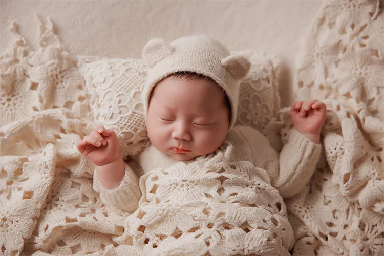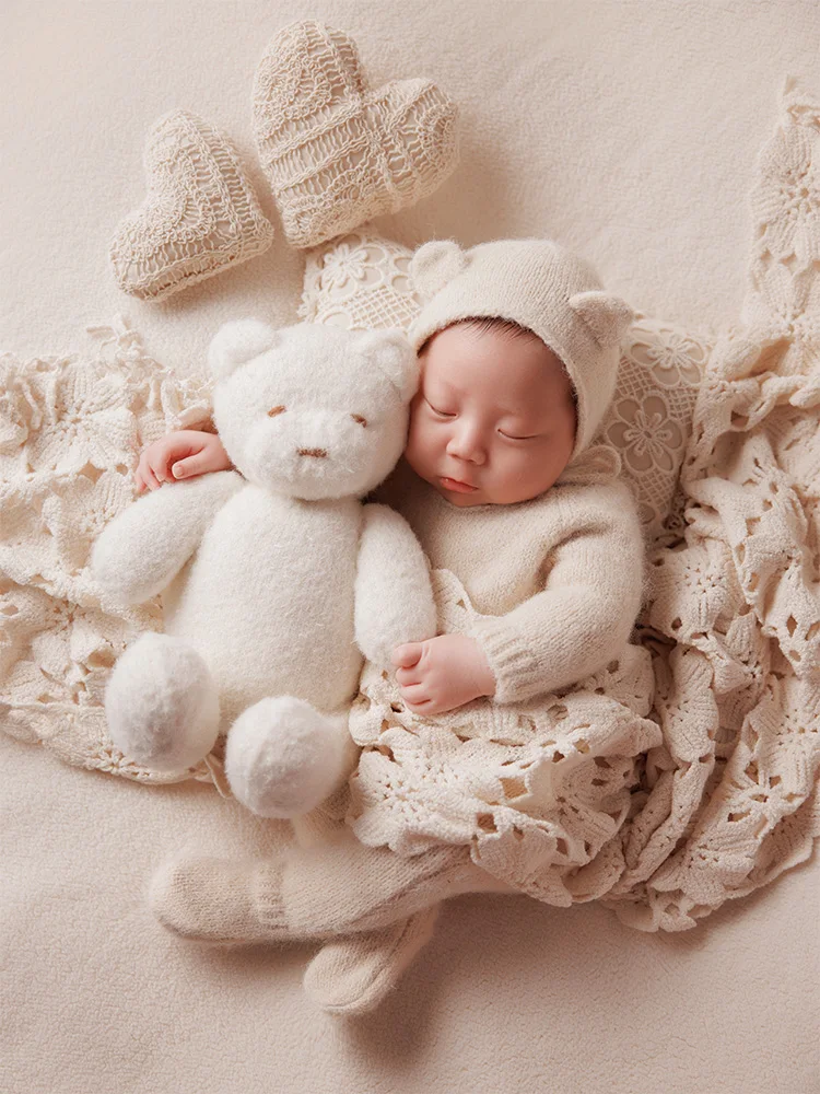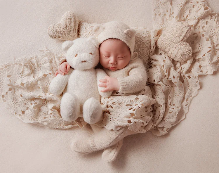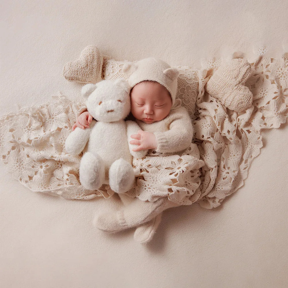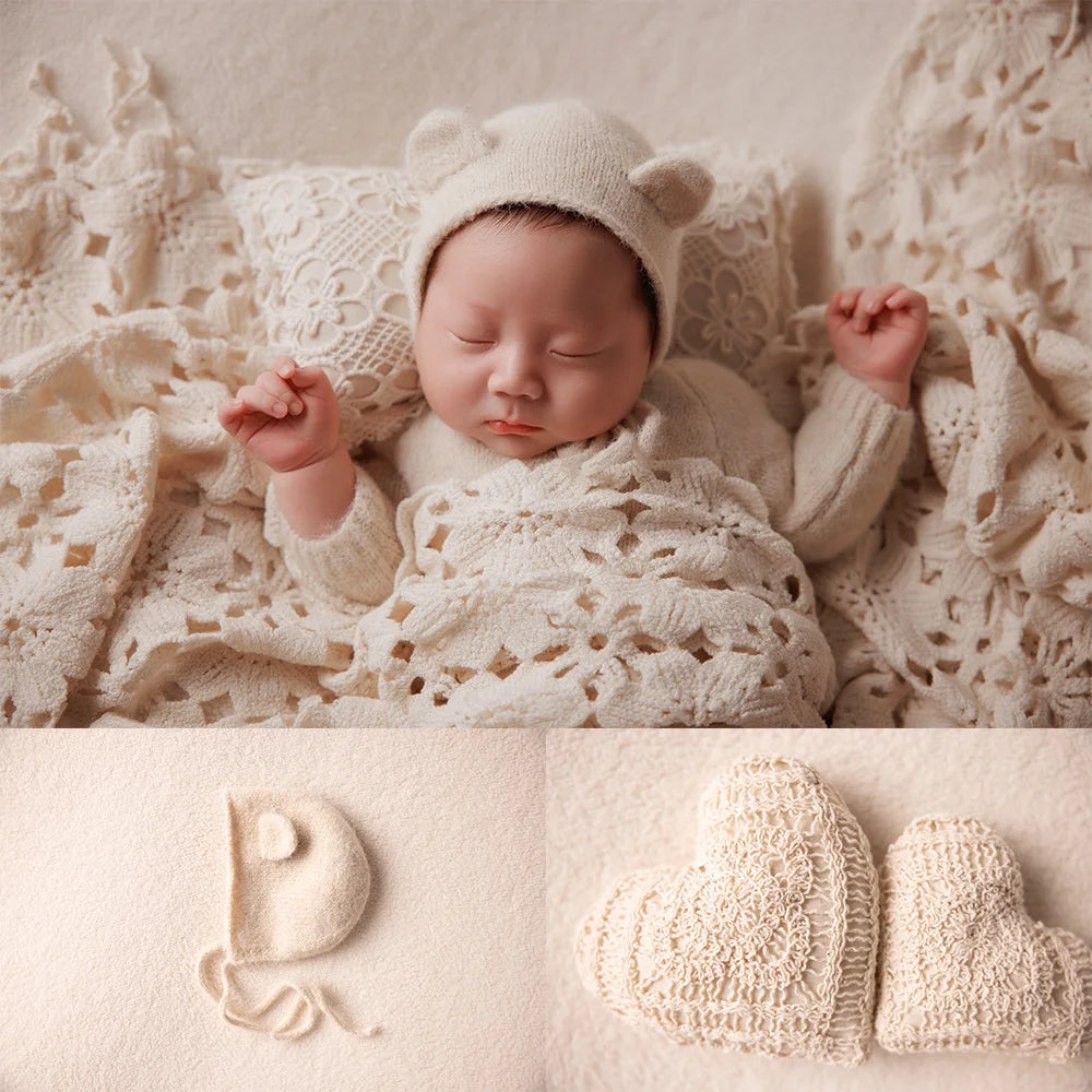 Baby Photography Costume Knitted Long-Sleeved Jumpsuit+Bear Ear Hat Teddy Bear Doll Photo Props Lace Pillow Shooting Accessories
