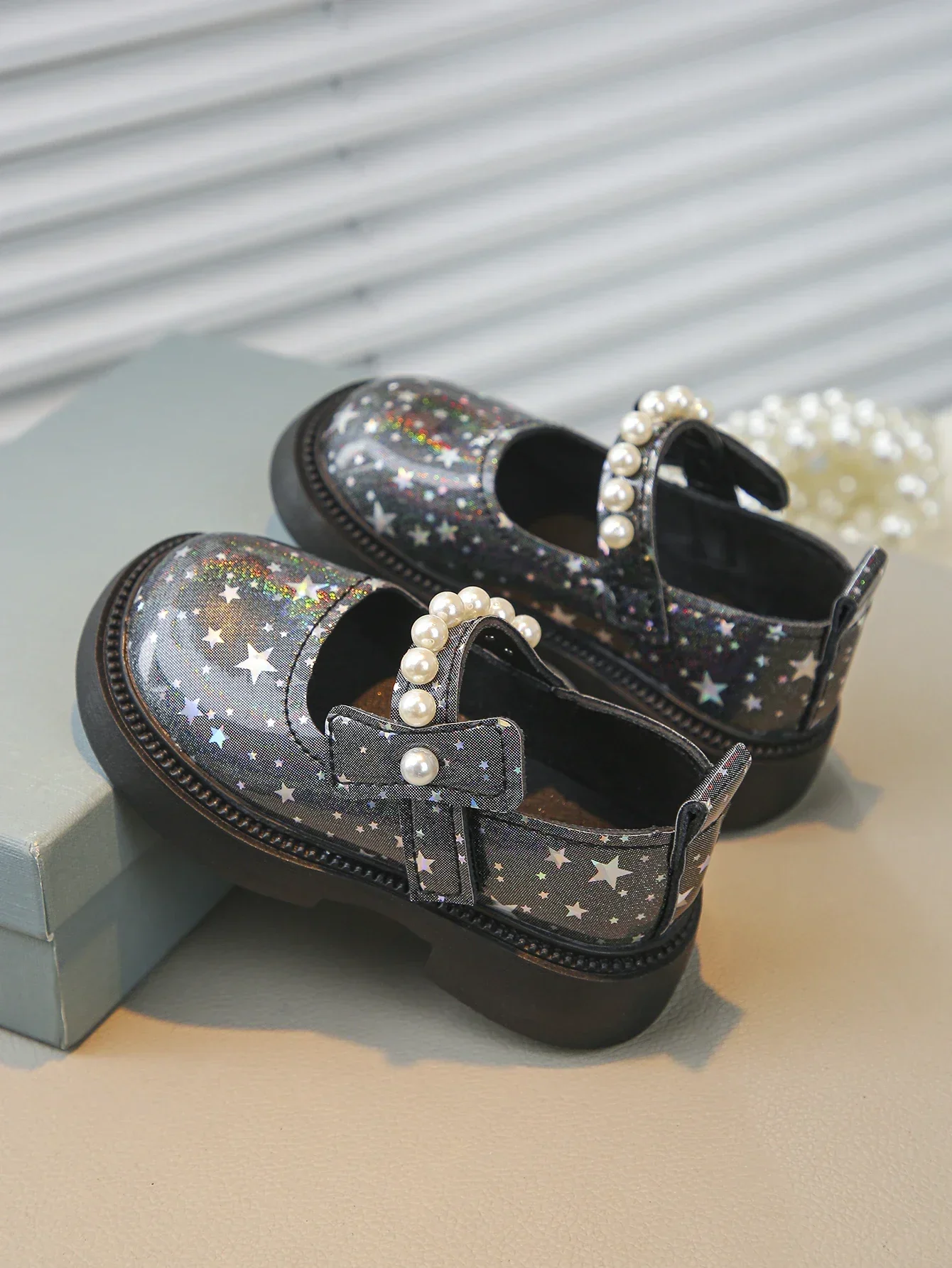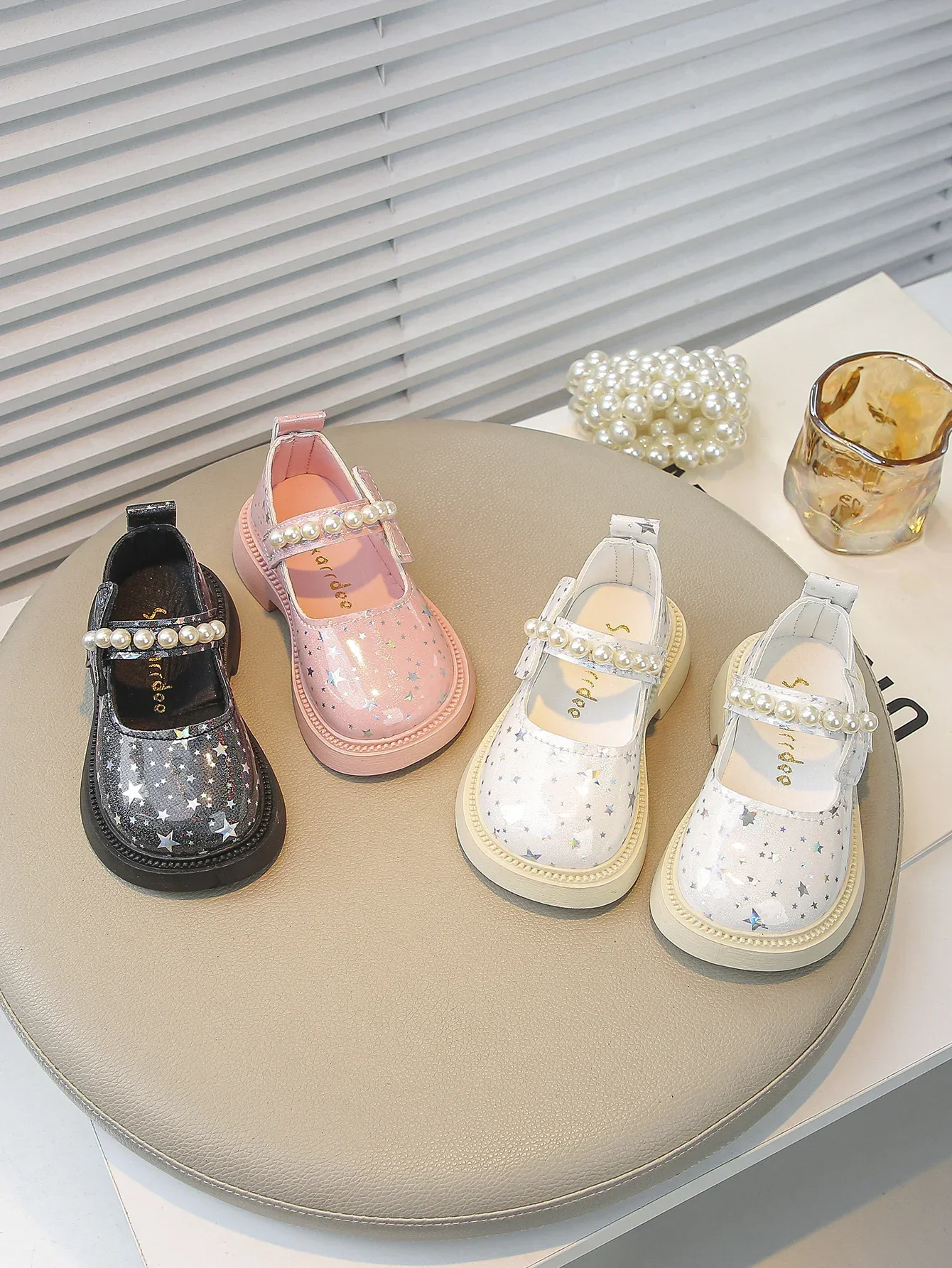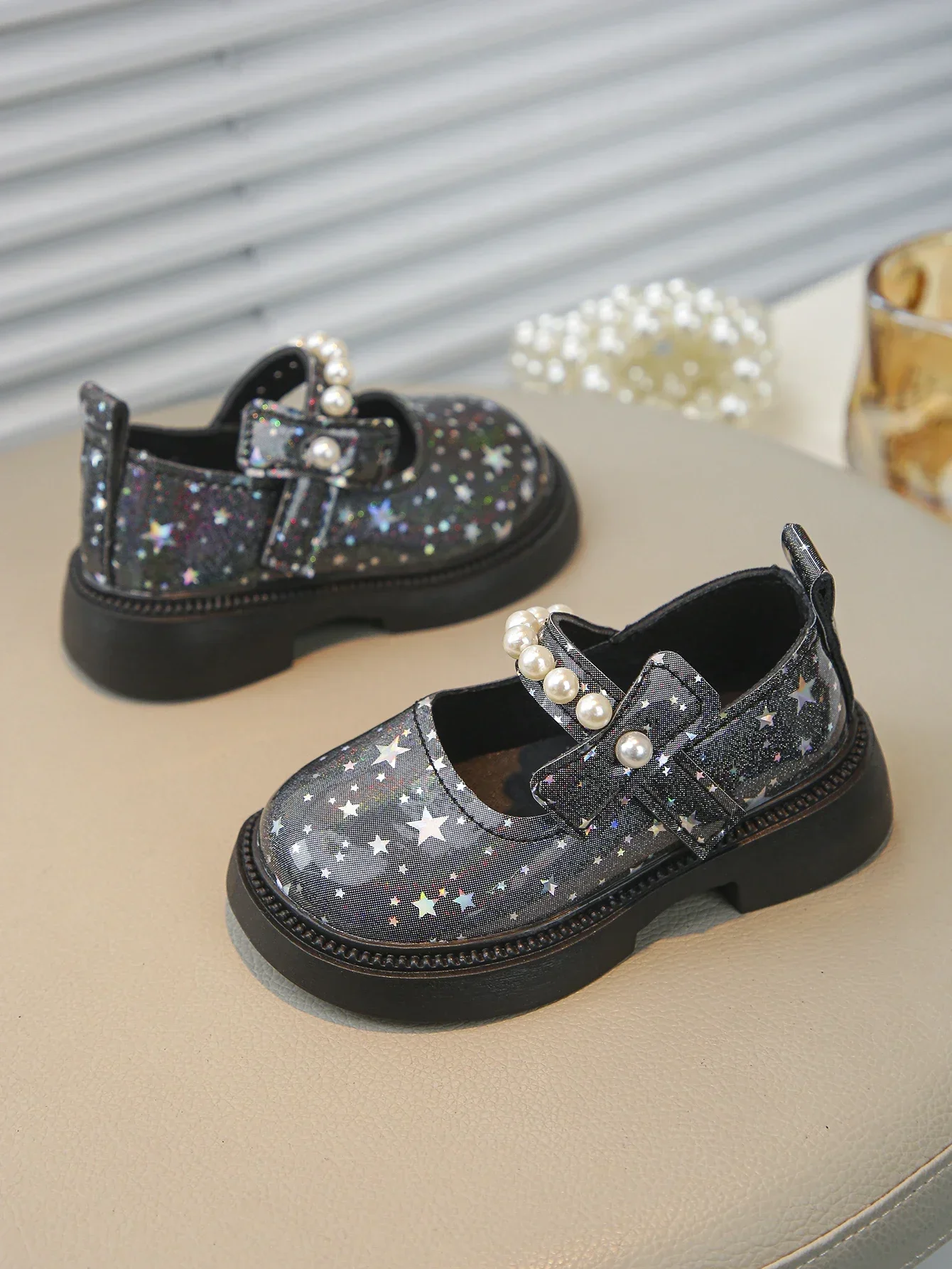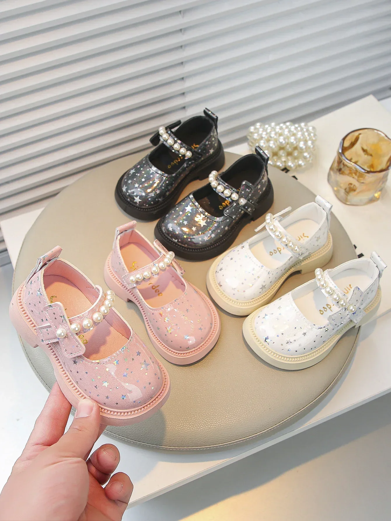 Bling All Over Stars Fashion Leather Shoes for Kids Girls Beading Black Pink White Rubber Children School Dress Shoes New I01163