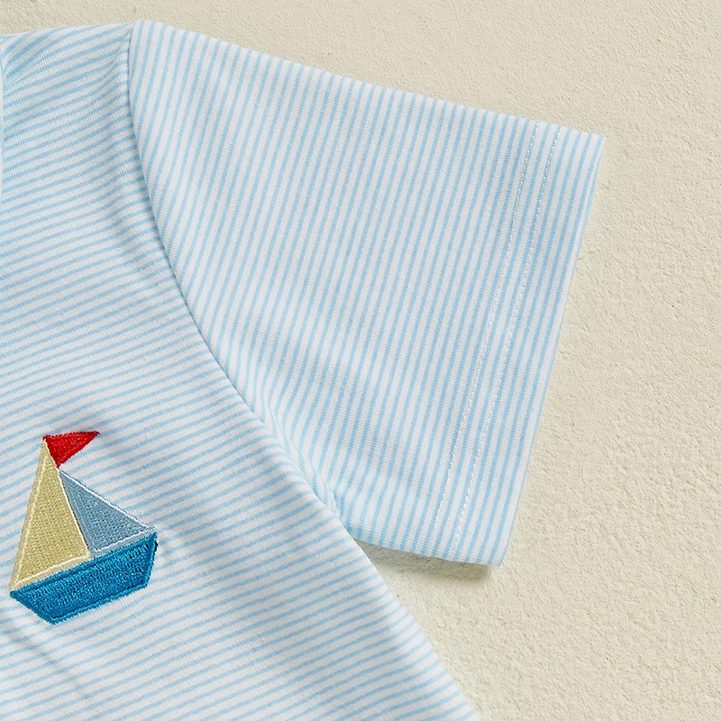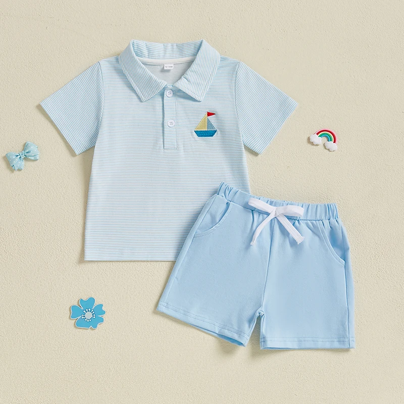 Boys Summer Outfit Sets with Short Sleeve Lapel Sailboat Embroidery Tops and Solid Color Shorts - Stylish and Comfortable