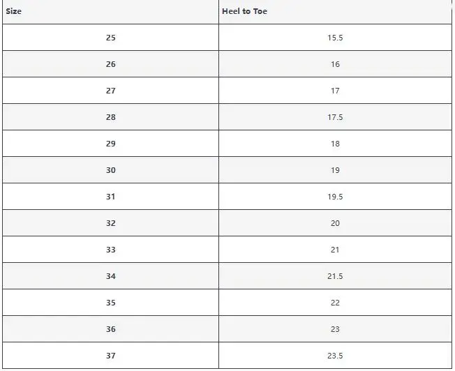 size_info: {"sizeInfoList":[{"length":{"cm":"15.5","inch":"6.10"},"size":"25","vid":-1},{"length":{"cm":"16","inch":"6.30"},"size":"26","vid":-3},{"length":{"cm":"17","inch":"6.69"},"size":"27","vid":-5},{"length":{"cm":"17.5","inch":"6.89"},"size":"28","vid":-7},{"length":{"cm":"18","inch":"7.09"},"size":"29","vid":-9},{"length":{"cm":"19","inch":"7.48"},"size":"30","vid":-11},{"length":{"cm":"19.5","inch":"7.68"},"size":"31","vid":-13},{"length":{"cm":"20","inch":"7.87"},"size":"32","vid":-15},{"length":{"cm":"21","inch":"8.27"},"size":"33","vid":-17},{"length":{"cm":"21.5","inch":"8.46"},"size":"34","vid":-19},{"length":{"cm":"22","inch":"8.66"},"size":"35","vid":-21},{"length":{"cm":"23","inch":"9.06"},"size":"36","vid":-23},{"length":{"cm":"23.5","inch":"9.25"},"size":"37","vid":-25}]}