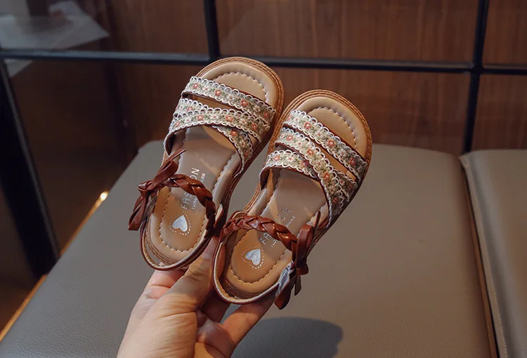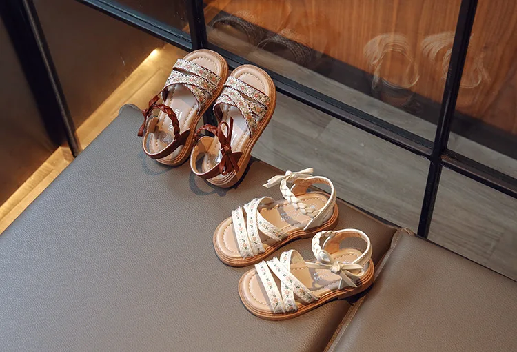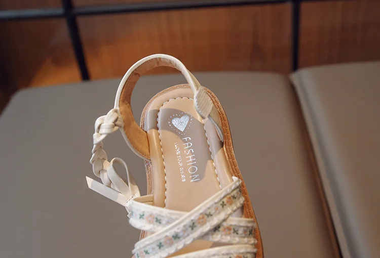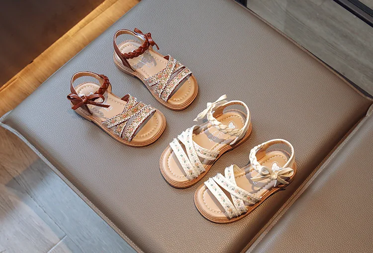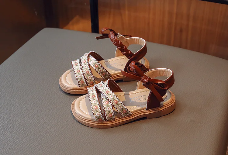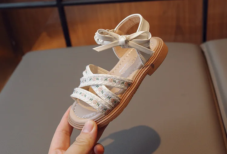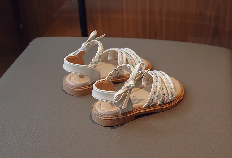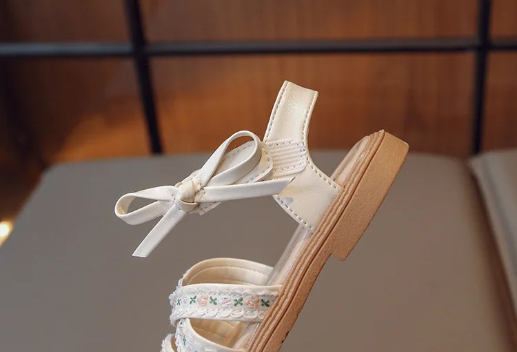 Children's Sandals Summer Sweet Embroider Flower Girls' Flat Shoes Fashion Bowknot Versatile Kid Princess Beach Sandals Open-toe