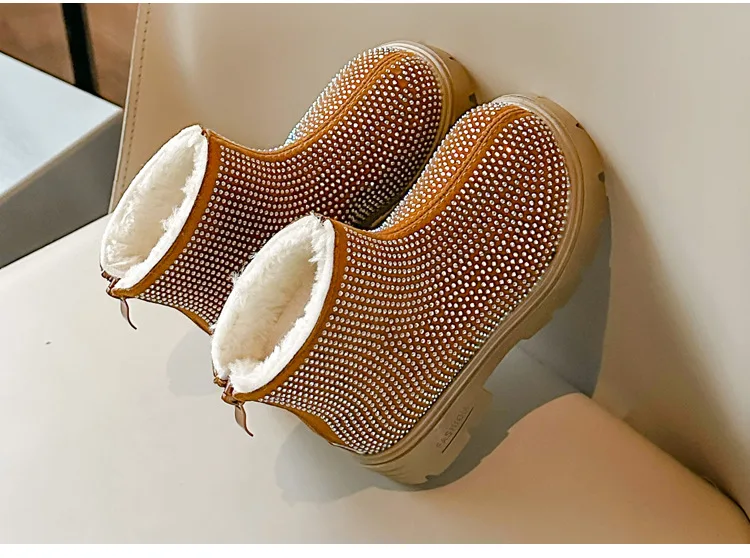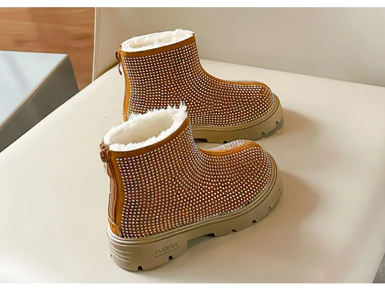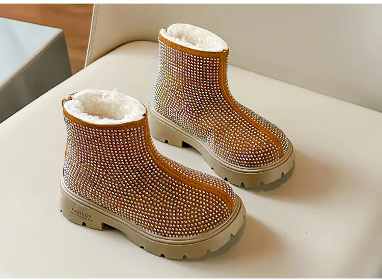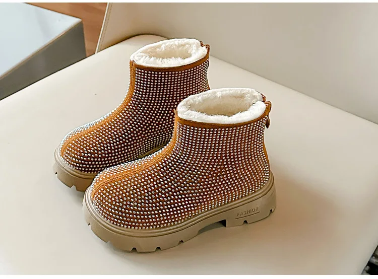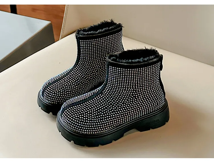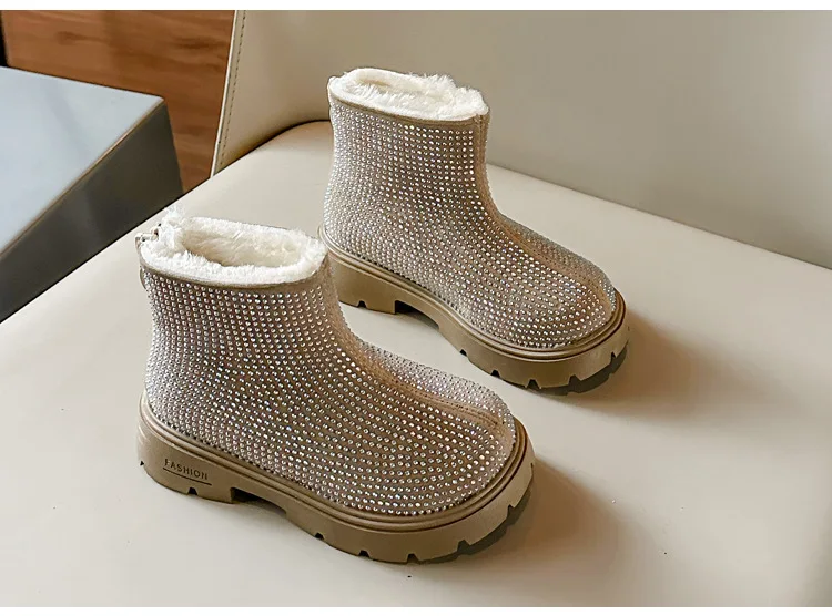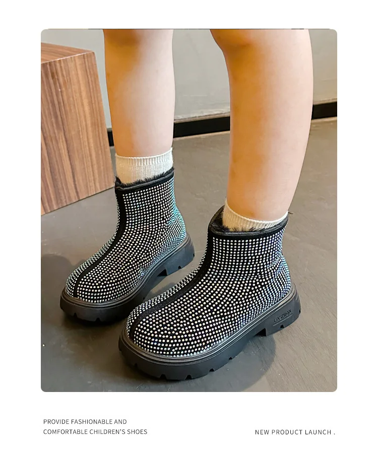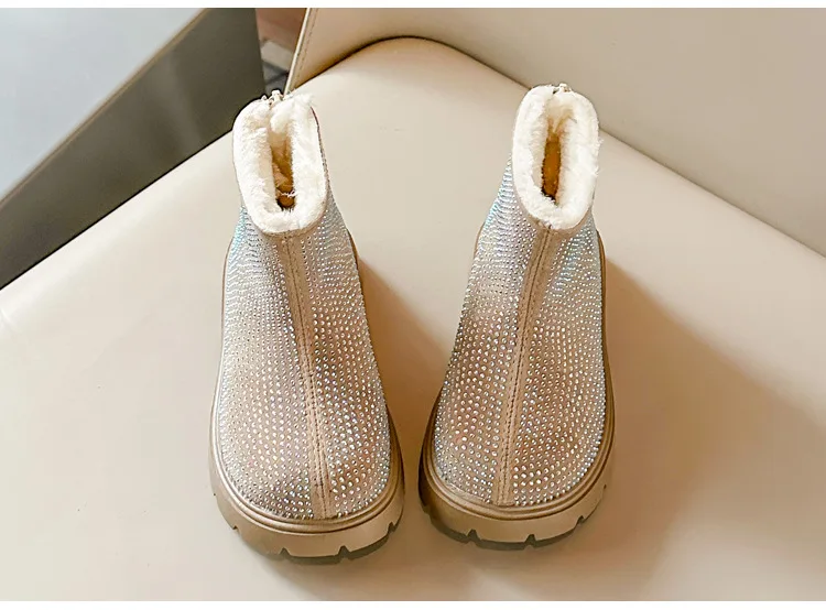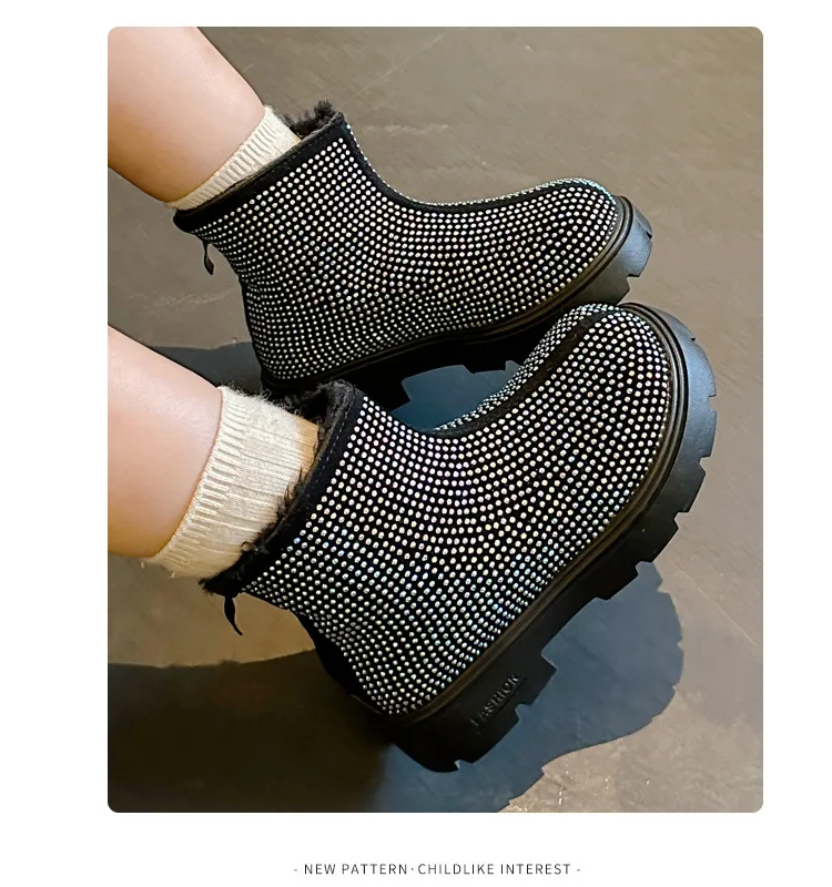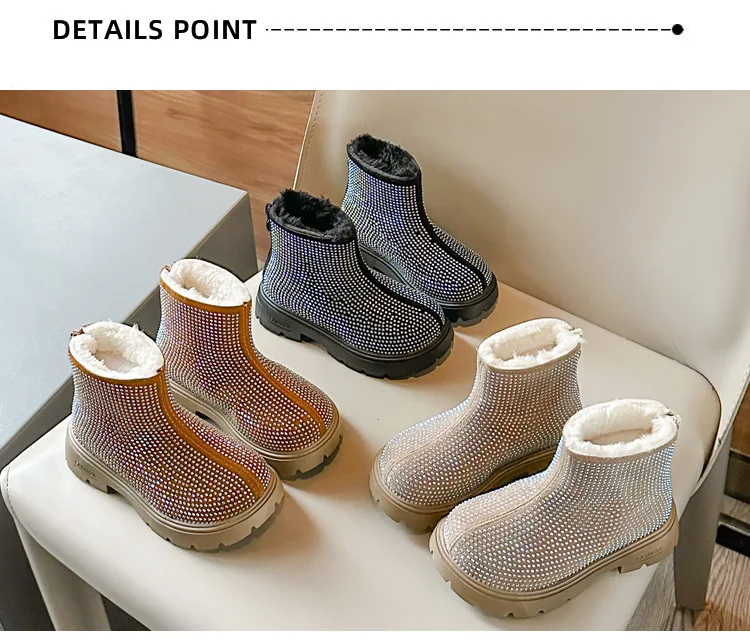 Fashion Girl Shoes New Versatile Comfort Ankle Boots Soft Sole Anti Slip Casual Rhinestone Winter Boot Warm Princess Kids Shoes