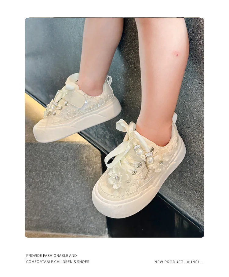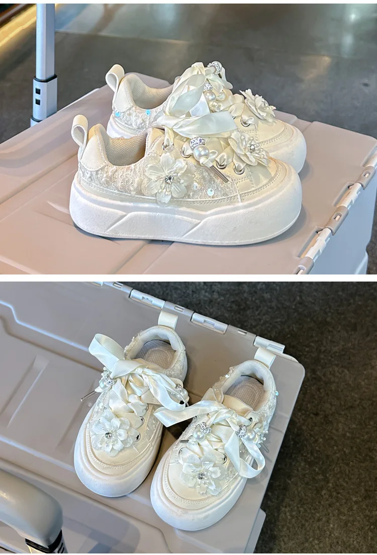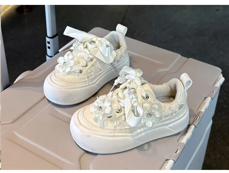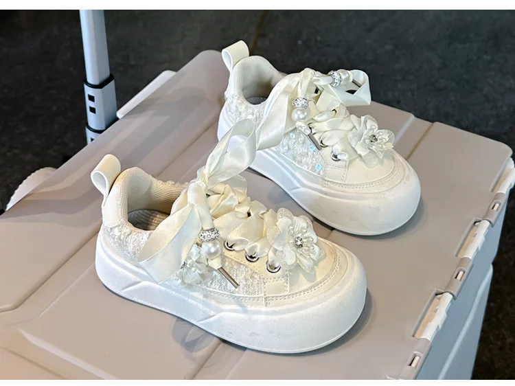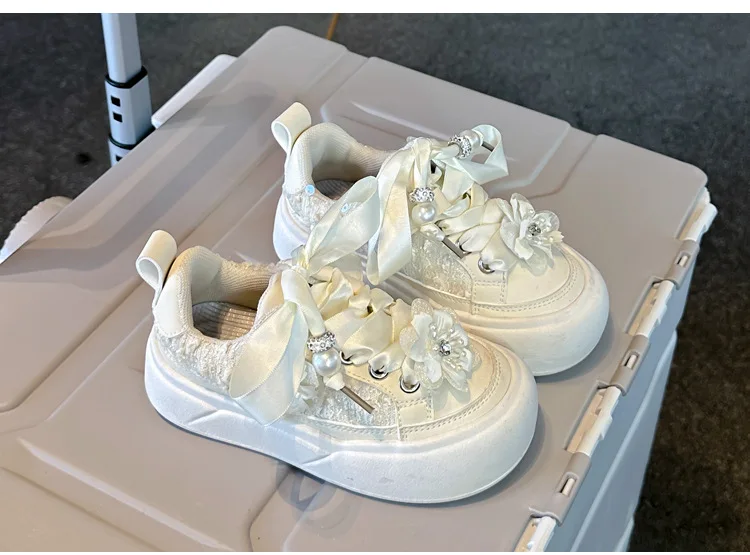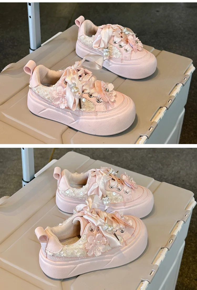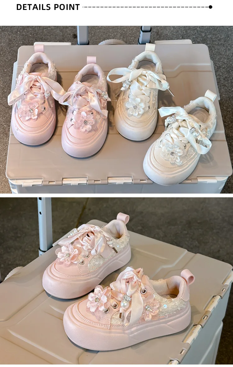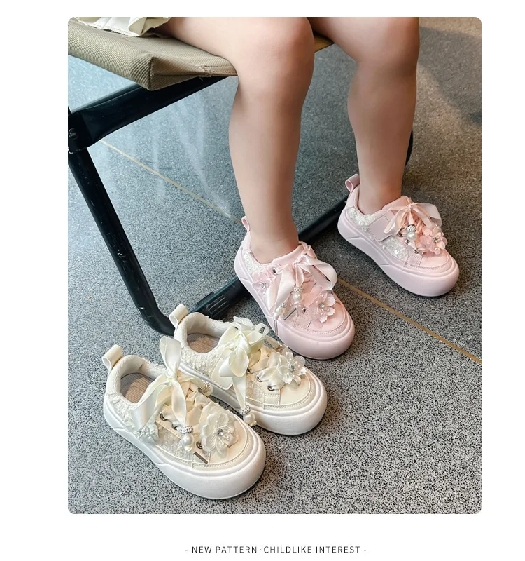 Girls Casual Shoes Chinese Style Kids Princess Shoes with Sweet Flowers 2024 Autumn New Girls Sports Shoes with Cute Ribbon Bow