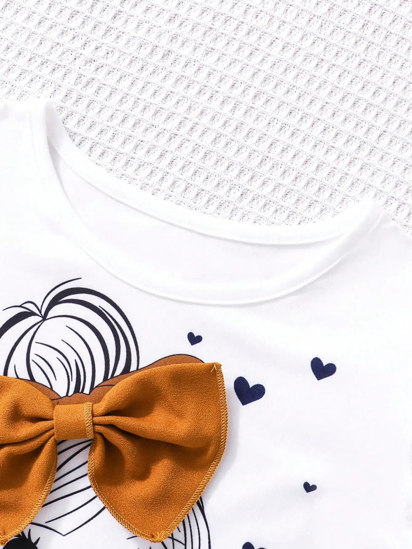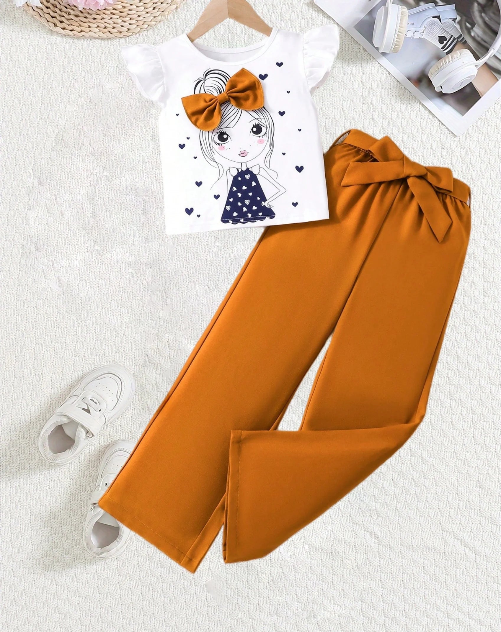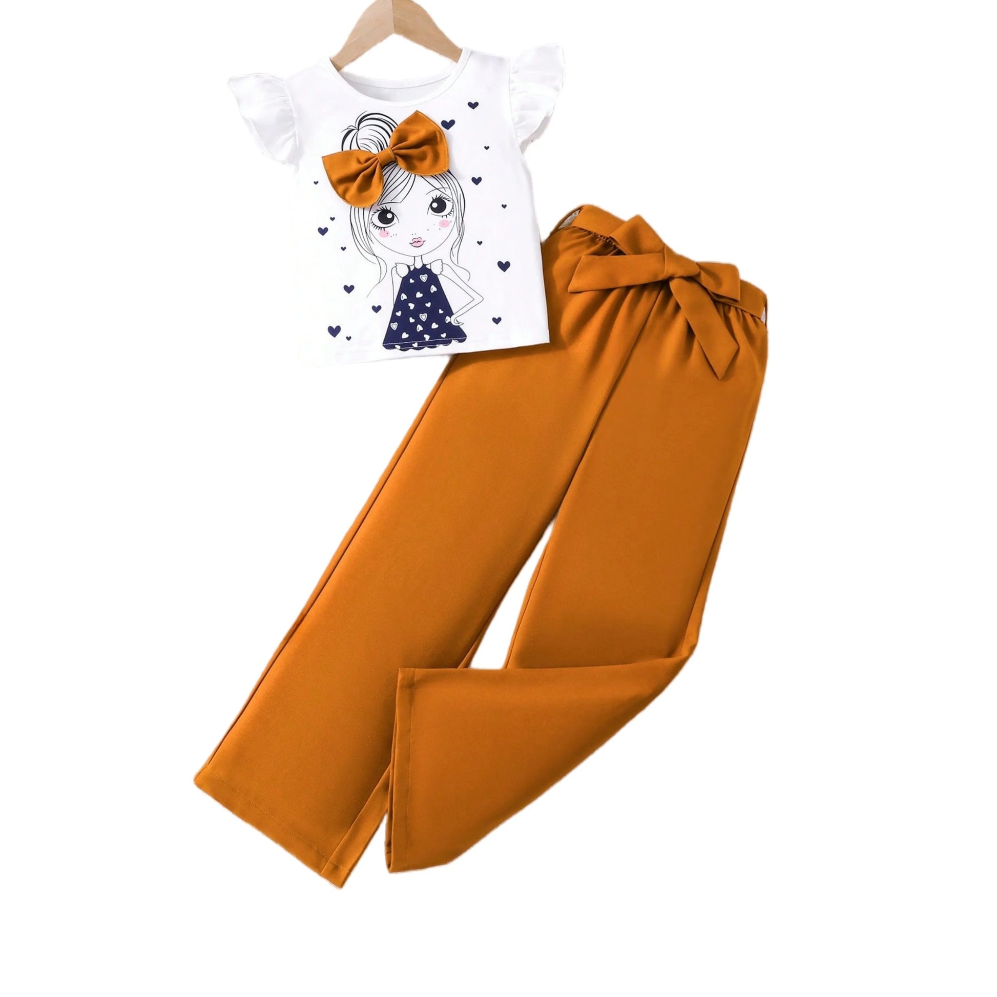 Girls Fashion Set: White Cartoon Print T-shirt with Bright Orange Bow Trousers