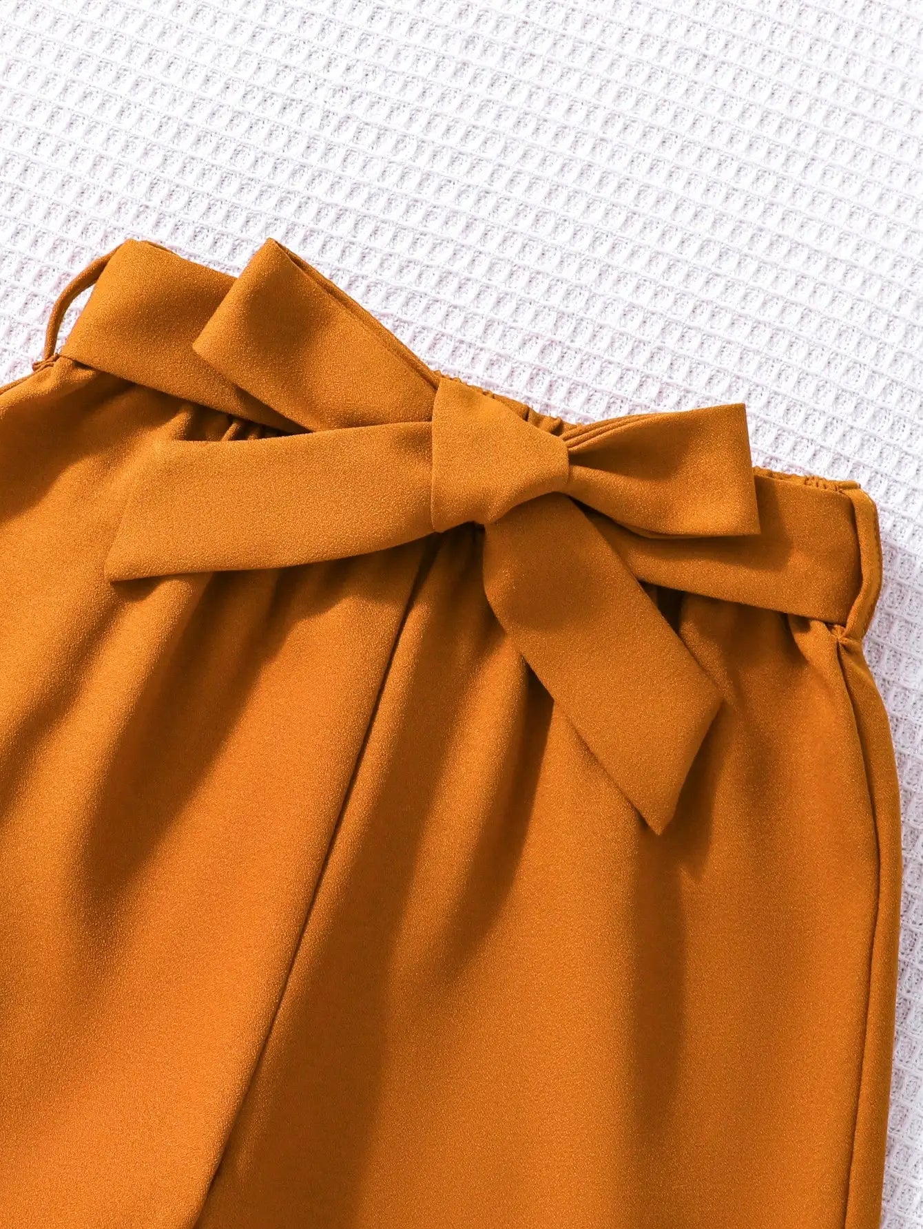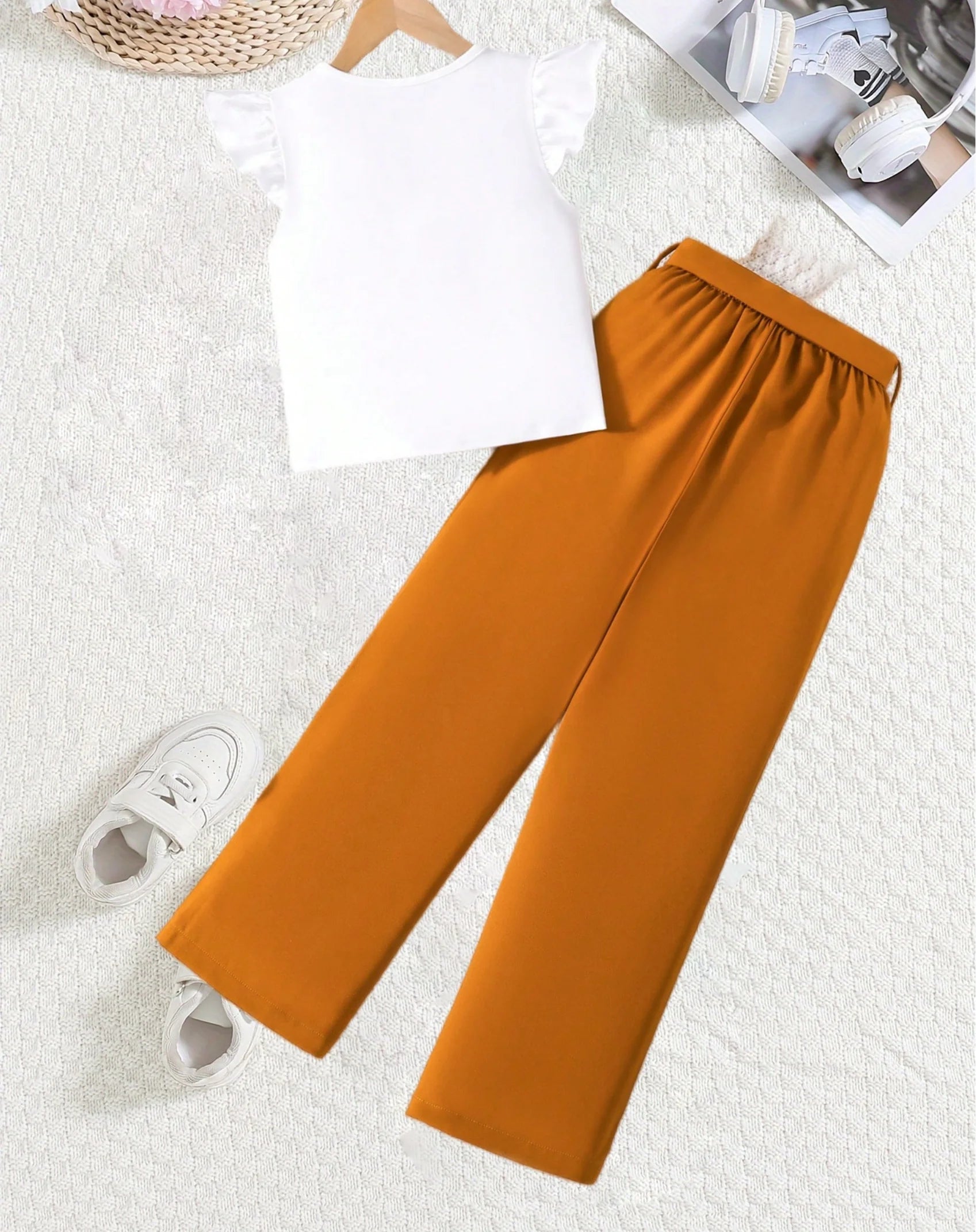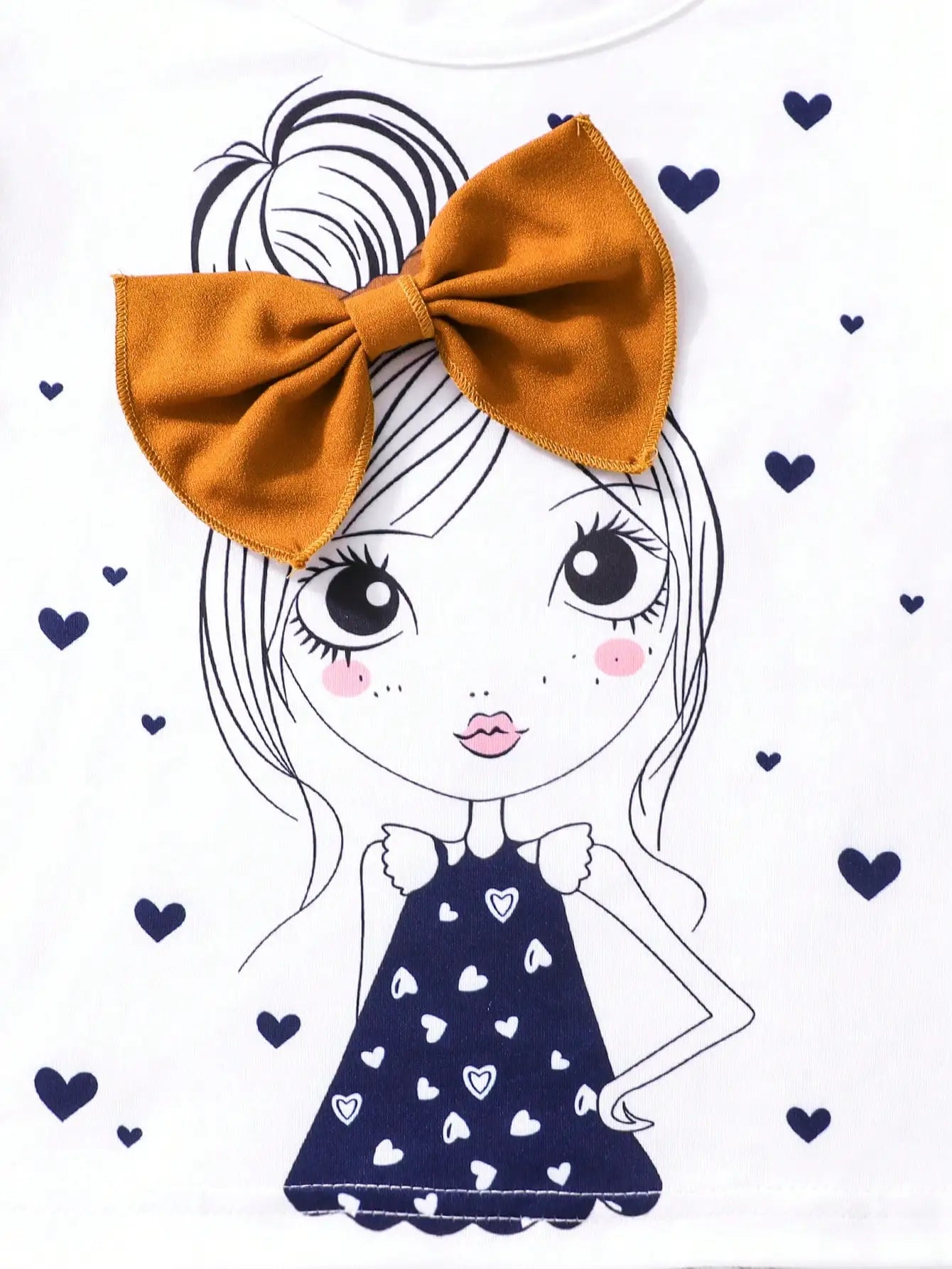 Girls Fashion Set: White Cartoon Print T-shirt with Bright Orange Bow Trousers