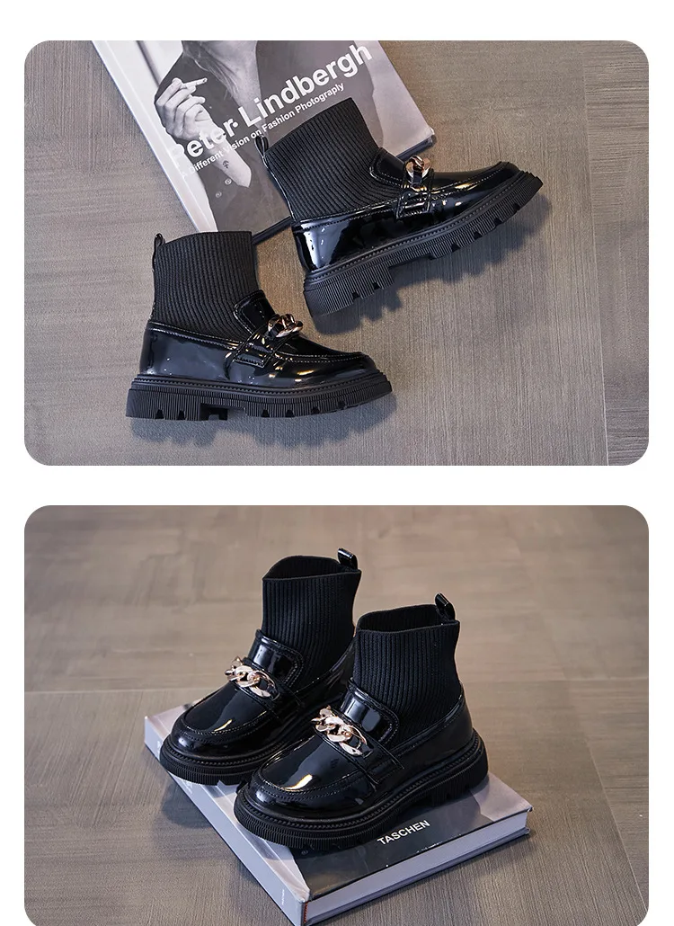 Girls Leather Boots Metal Chains Flying Woven Stitching Princess Boots Kids Leather Soft Sole Boots Children Socks Boots Fashion
