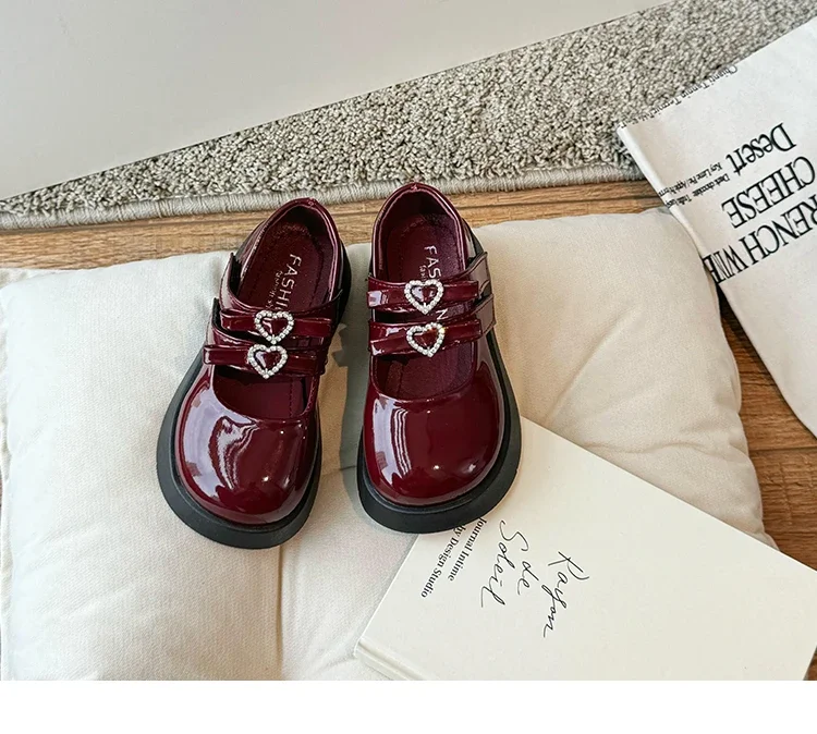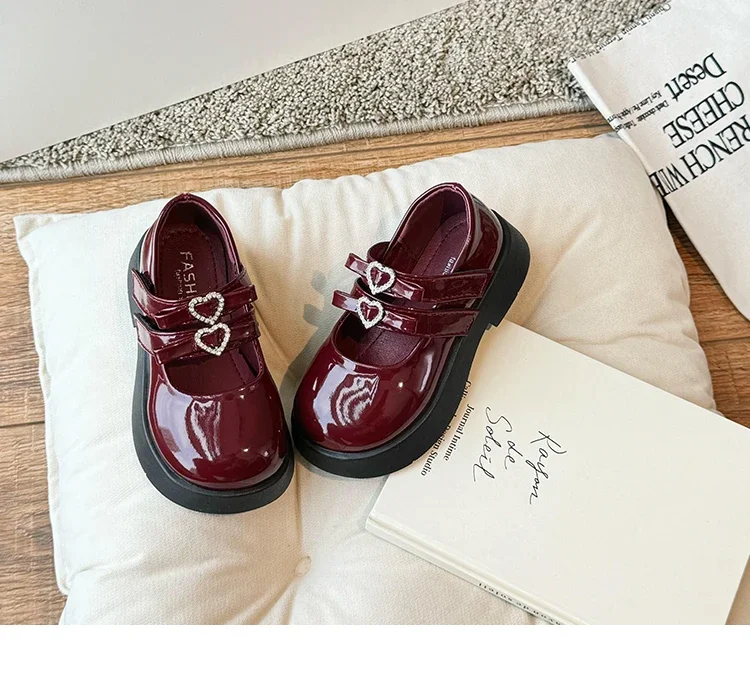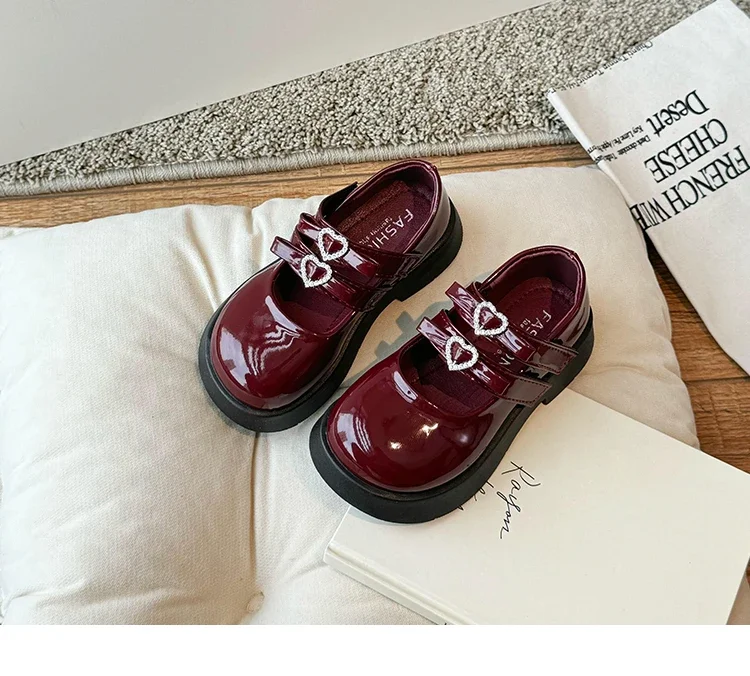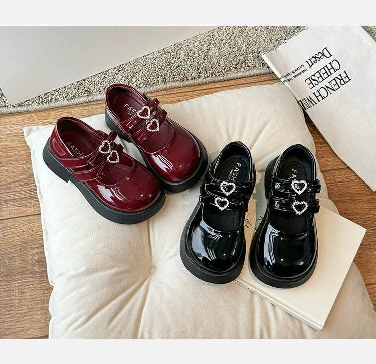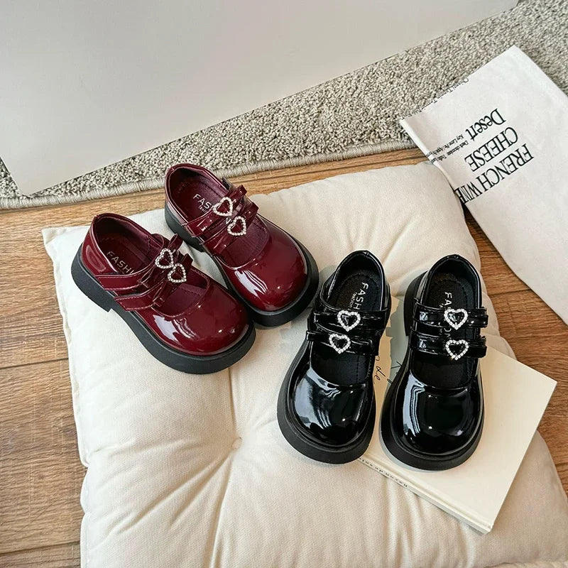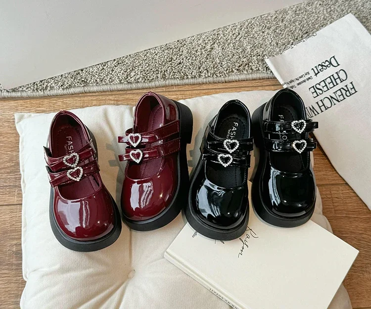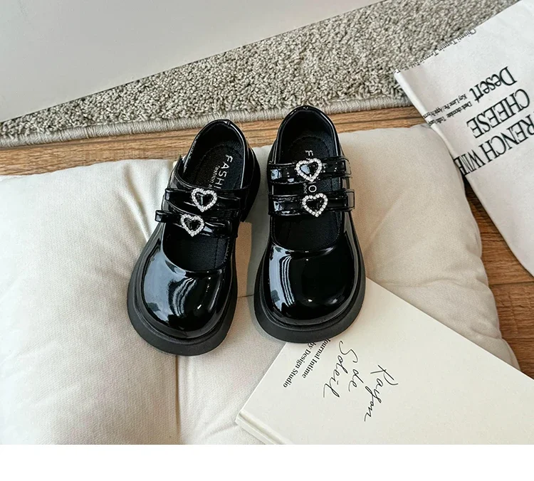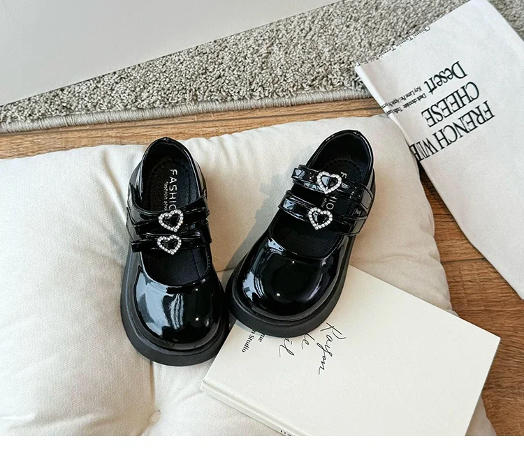 Girls Princess Shoes with Love Bow Kids Black Performance Dance Shoes for Party 2024 New Girls Leather Shoes Round Toe Soft Sole