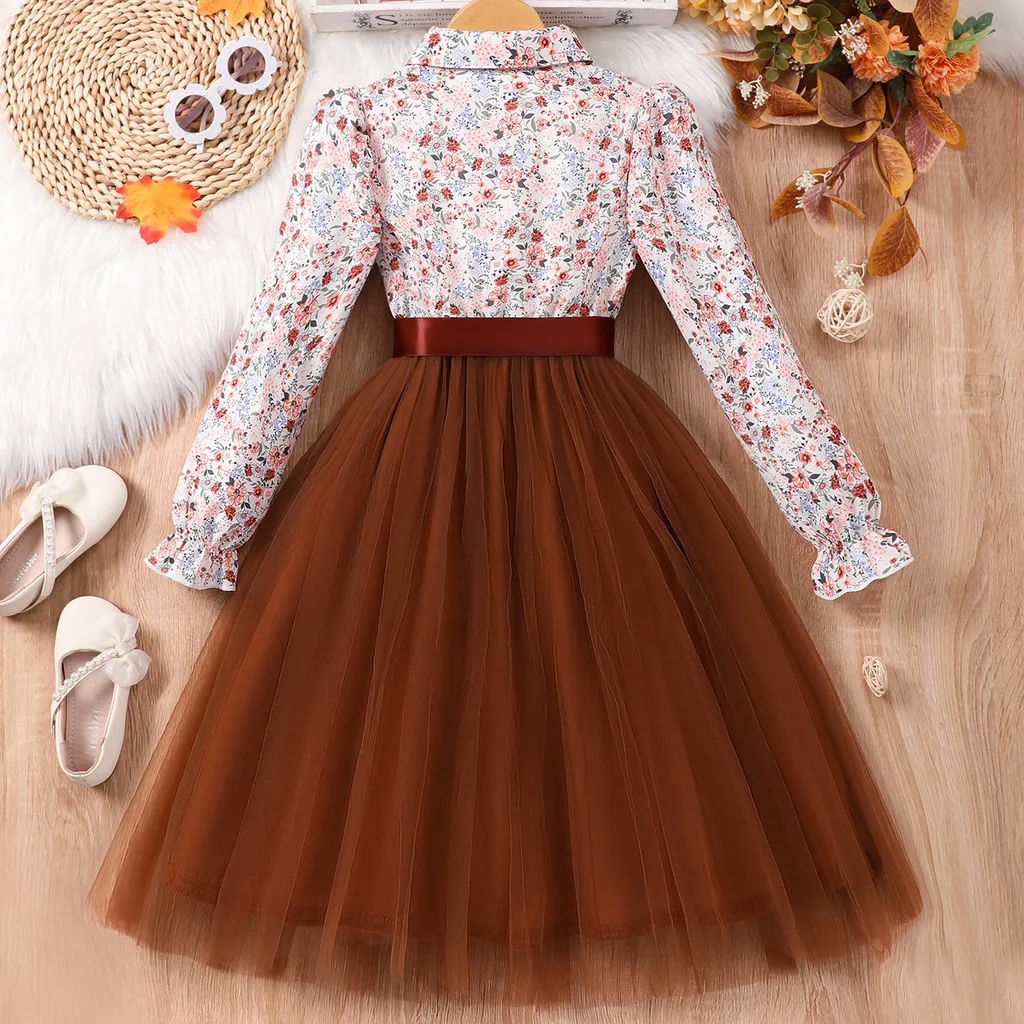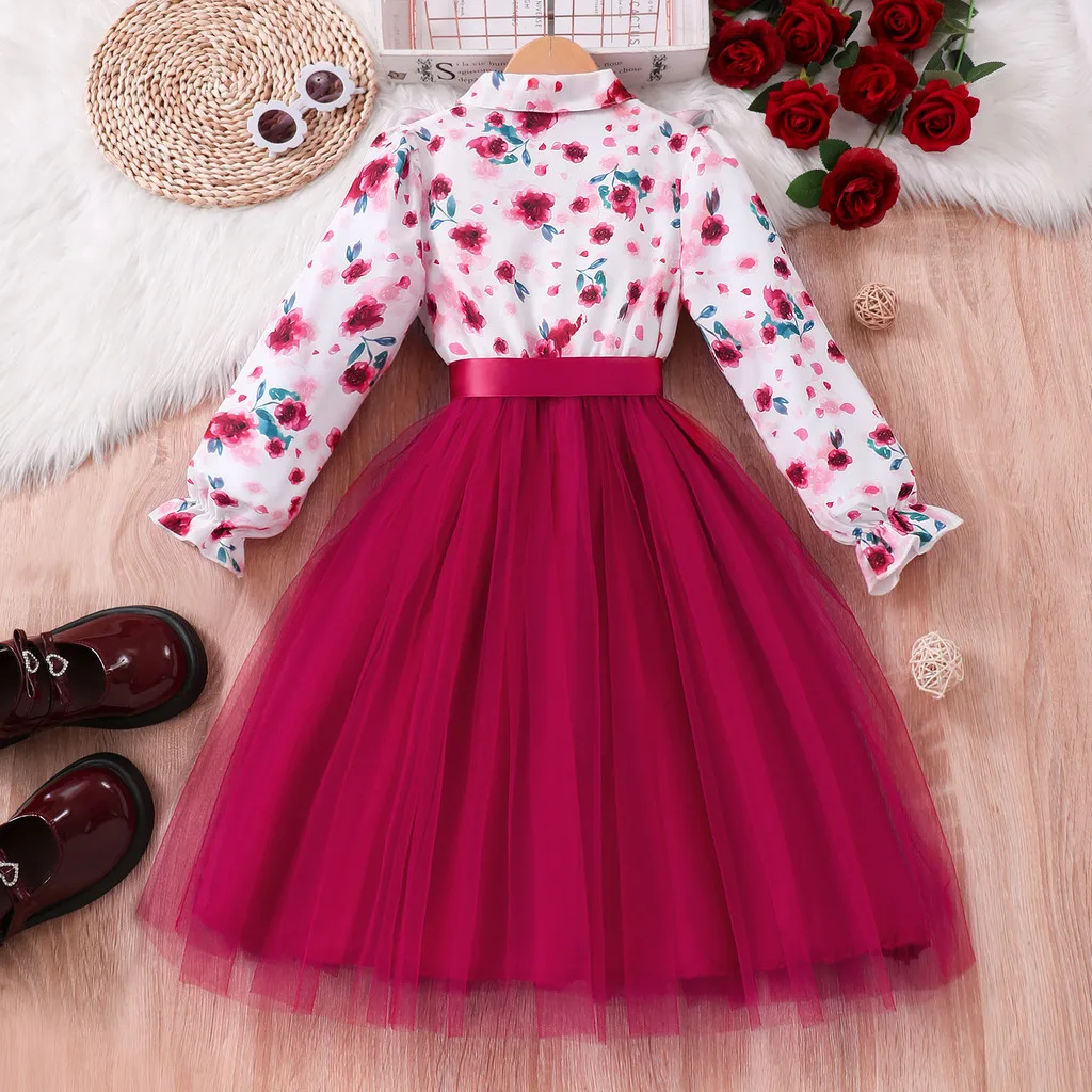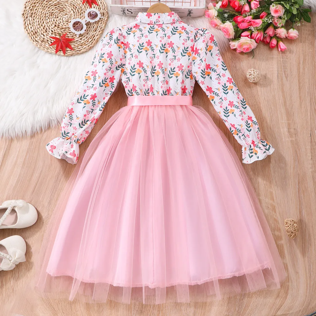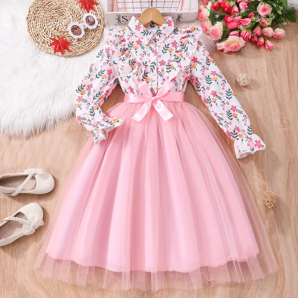 Kids Girls Dress Summer Long Sleeve Floral Gauze Belt Children Dress Casual Sweet Elegant Teen Princess Dress 7 8 9 10 11 12 Yrs