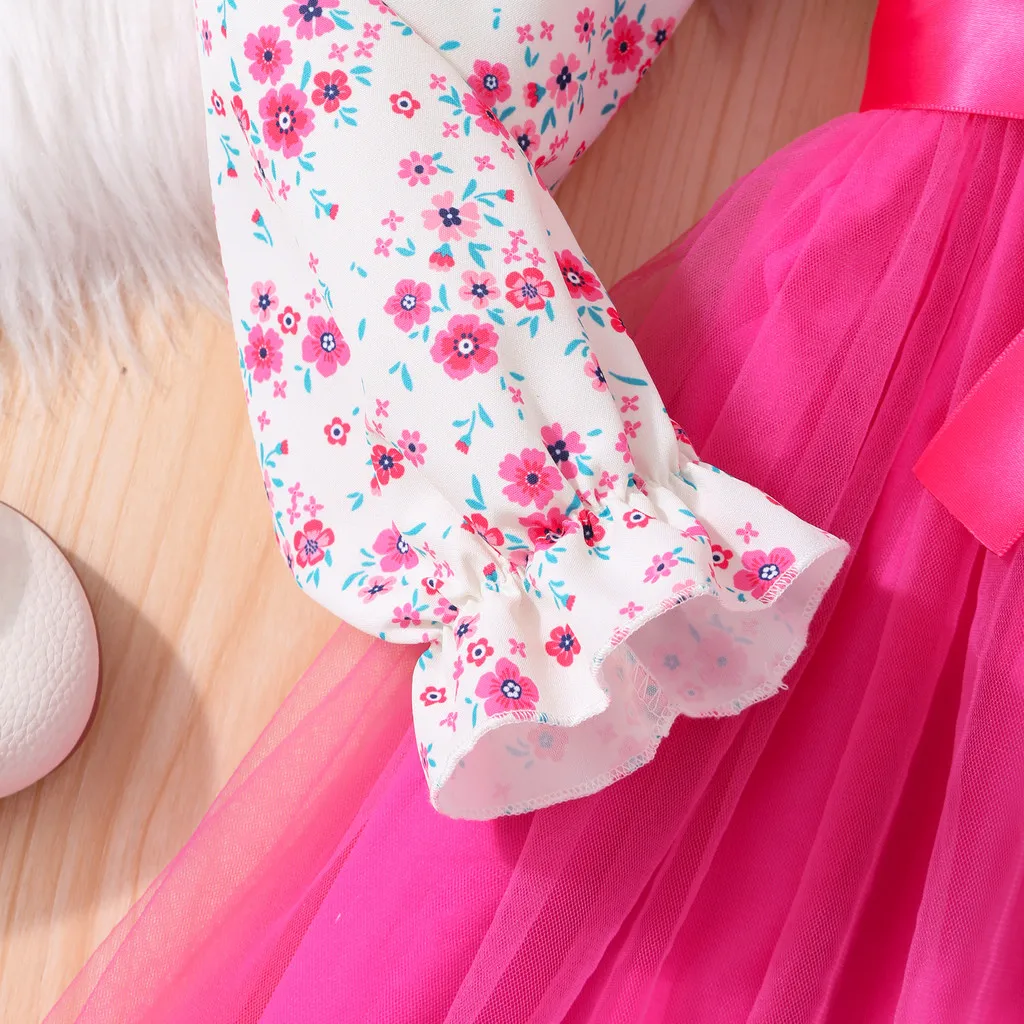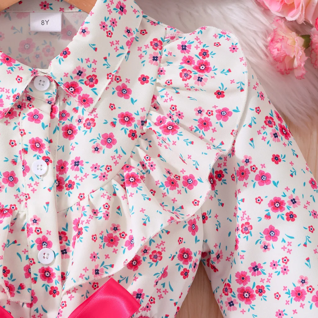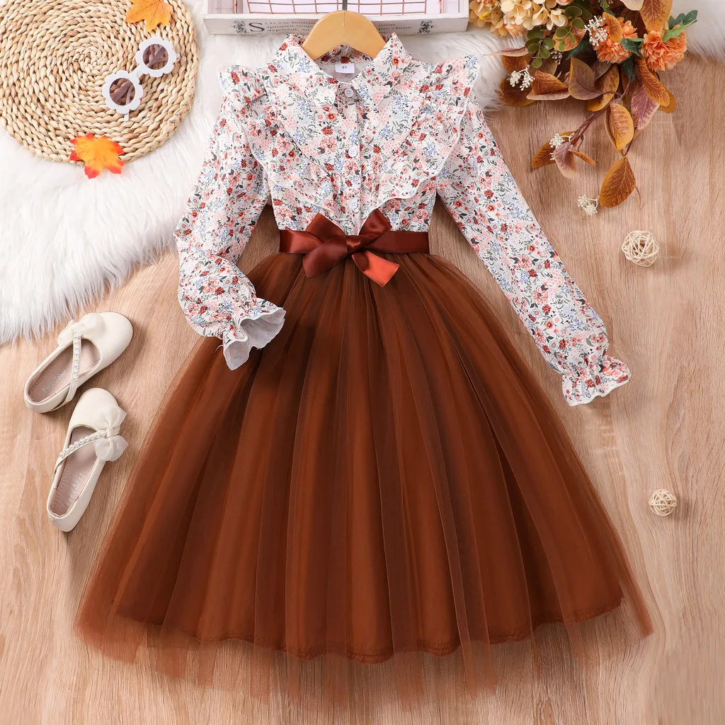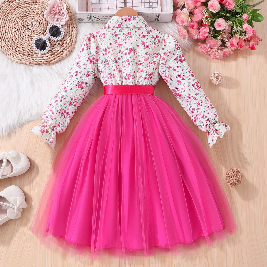 Kids Girls Dress Summer Long Sleeve Floral Gauze Belt Children Dress Casual Sweet Elegant Teen Princess Dress 7 8 9 10 11 12 Yrs