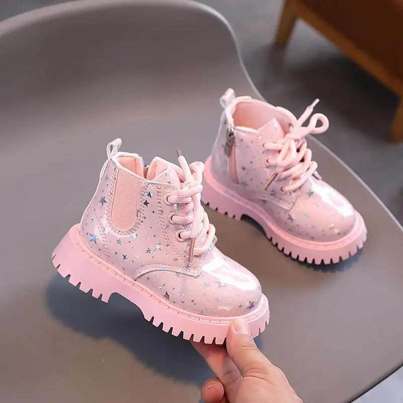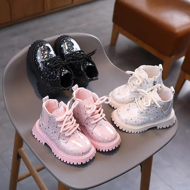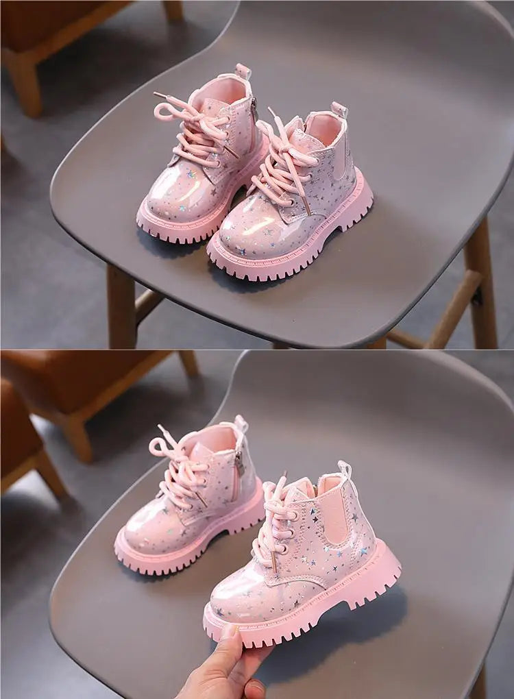 New Children Martine Boots Non-slip Soft Sole Walking Shoes PU Leather Sparkle Boots Lace Up Side Zipper Pure Color Casual Shoes