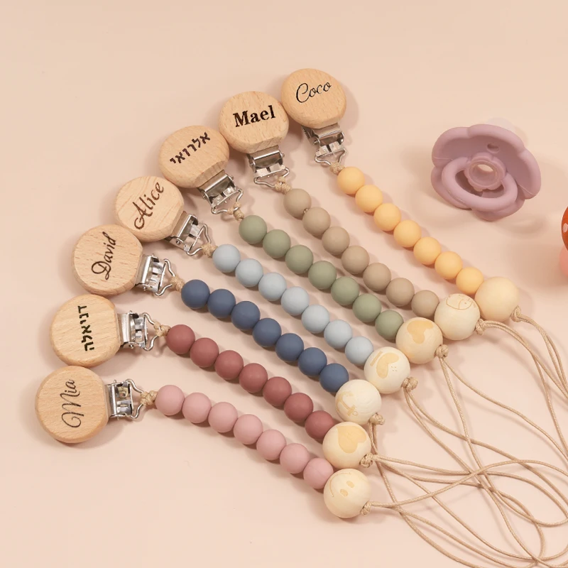 Personalized Baby Pacifier Clip Custom Name Silicone Bead Nipple Dummy Clips Engraved Infant Wood Pacifier Holder Newborn Gift