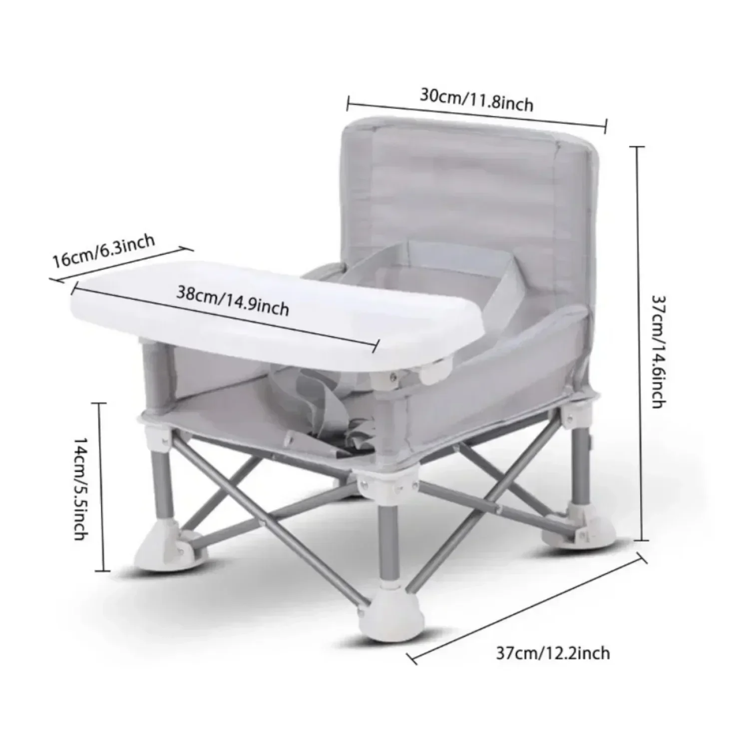 Compact and Foldable: The child seat is compact and foldable for mobility and storage , which is convenient for travelling and cleaning. Dimensions (folded): 39 x 18 x 5 cm (L x W x H). Size (expand): 38 x 37 x 31 cm (L x H x W). The foldable chair is suitable for babies and toddlers from 6-36 months with a weight only up to 1.1KG.