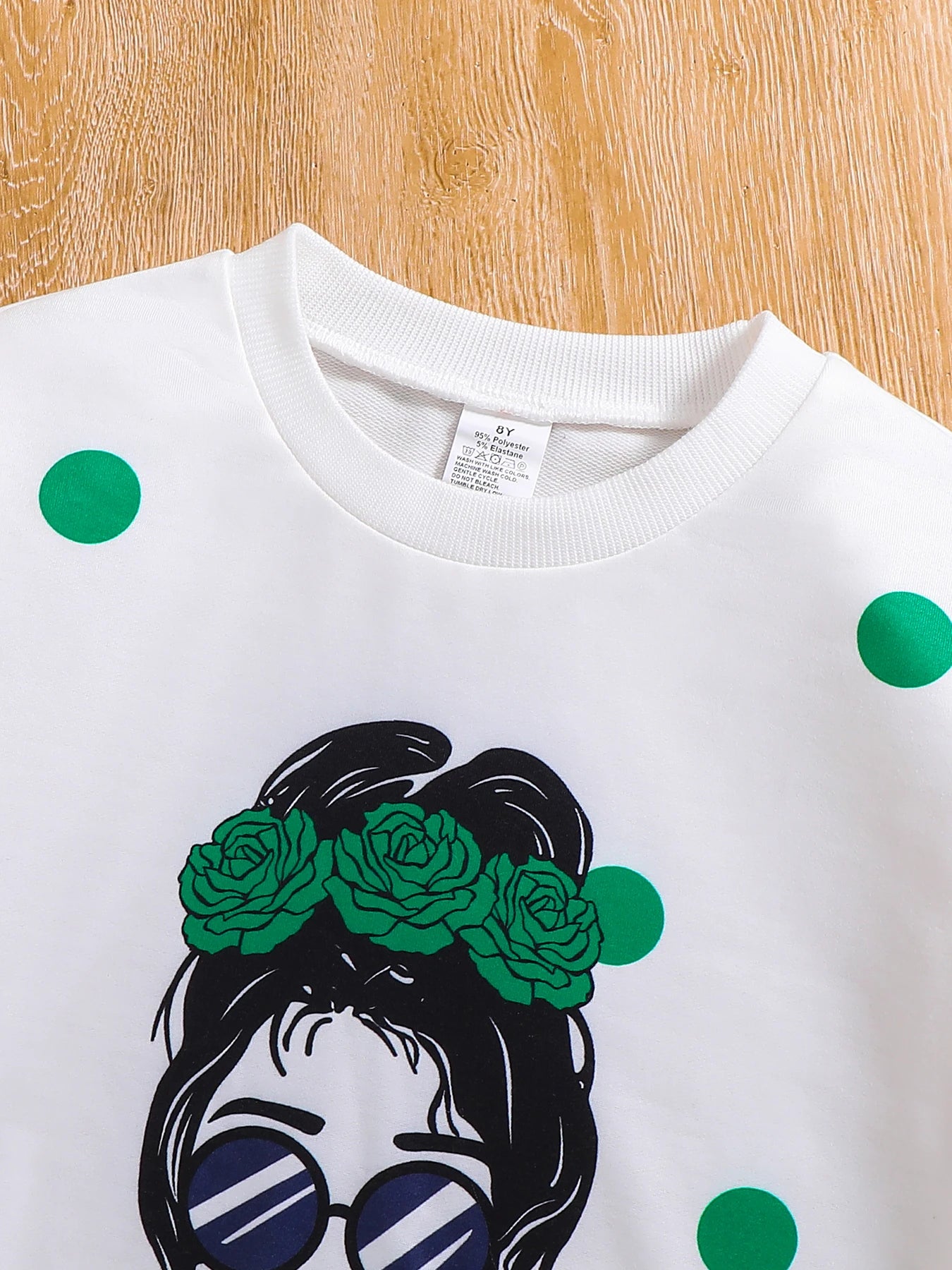 Spring and Autumn girls fashion 2 sets knitted round neck free girl print long sleeve + green slim casual pants suit