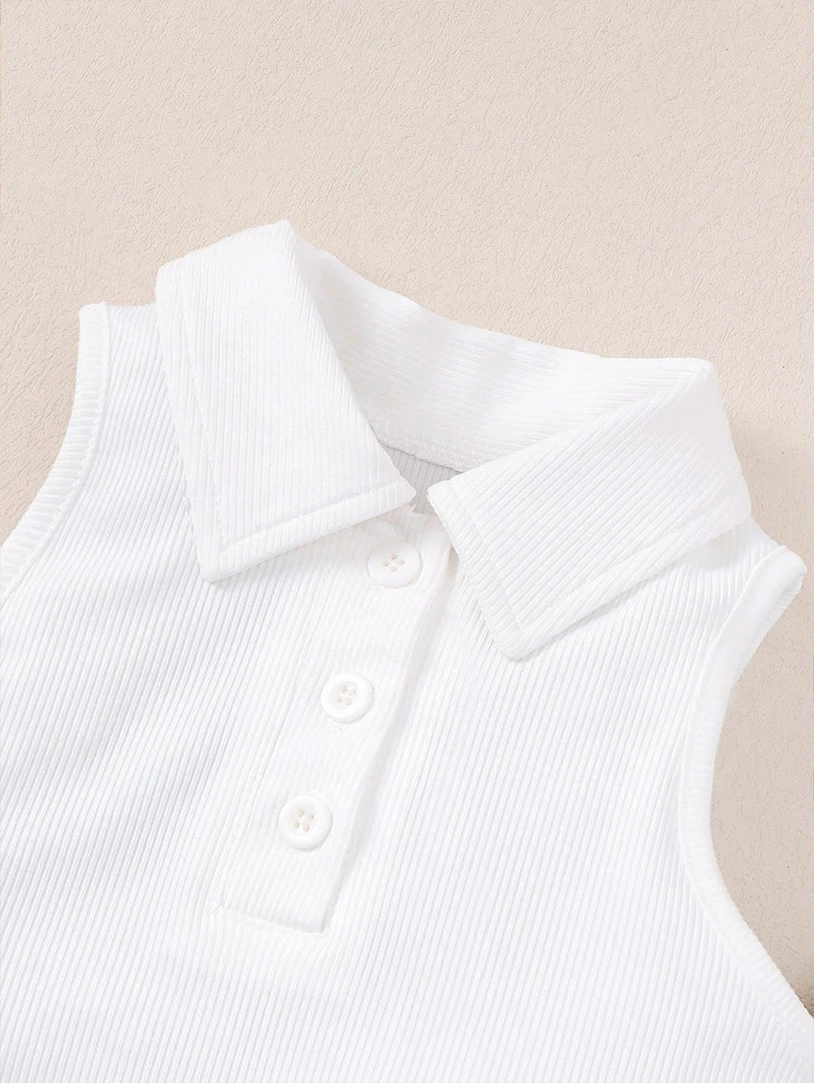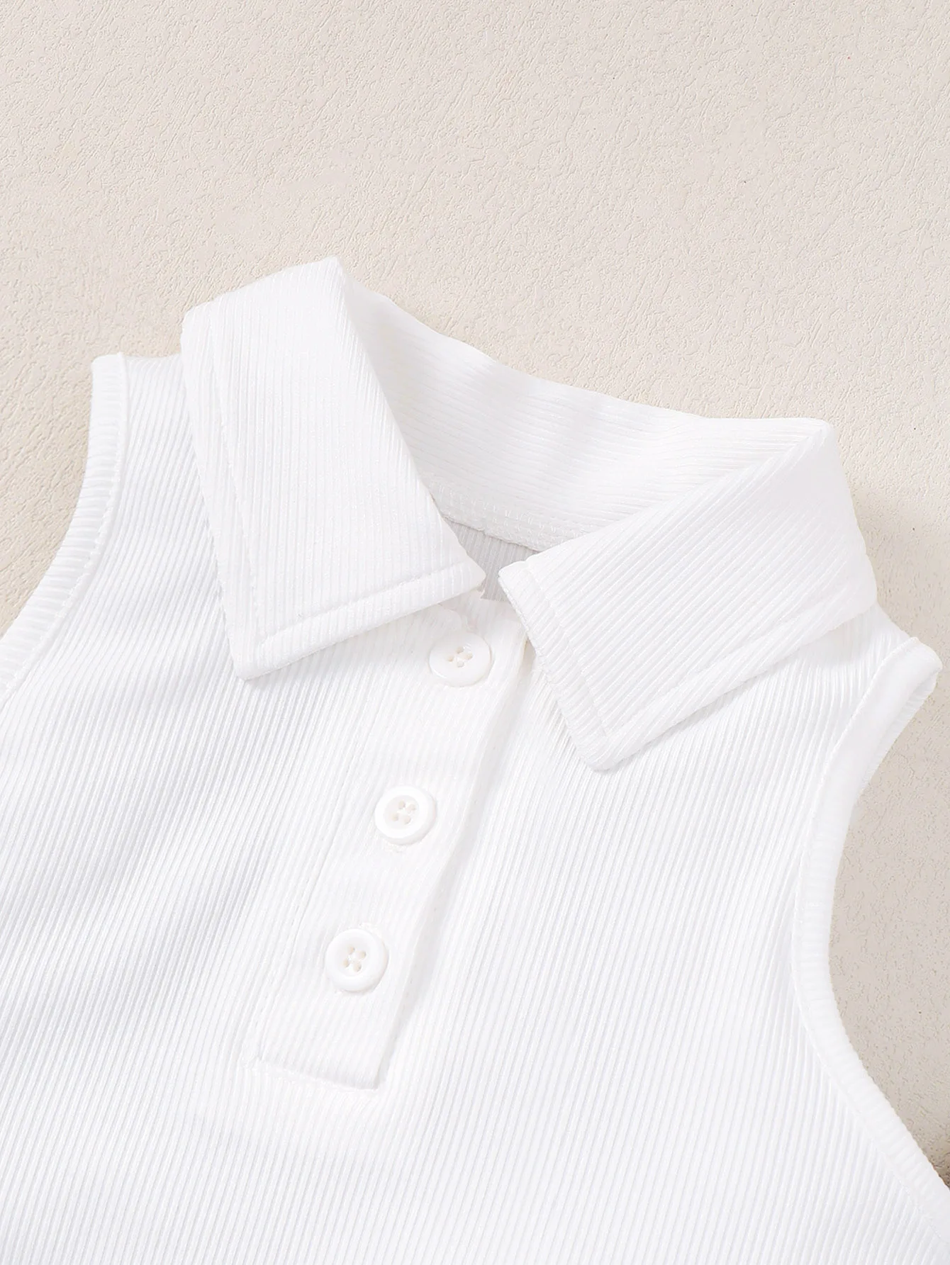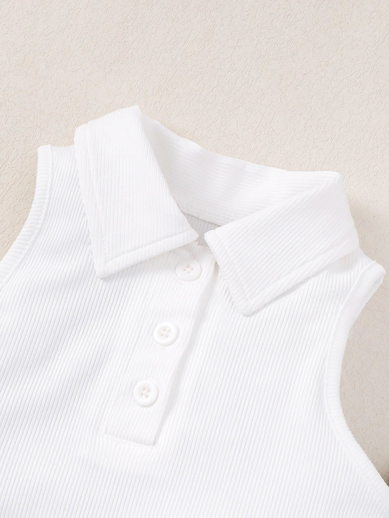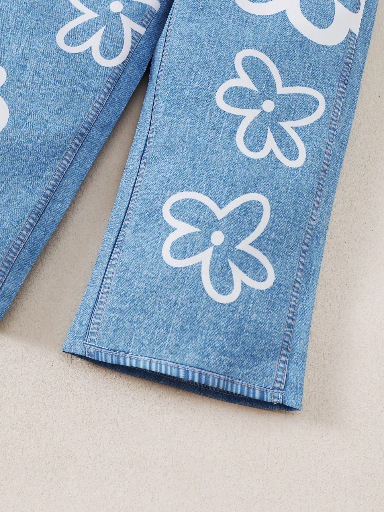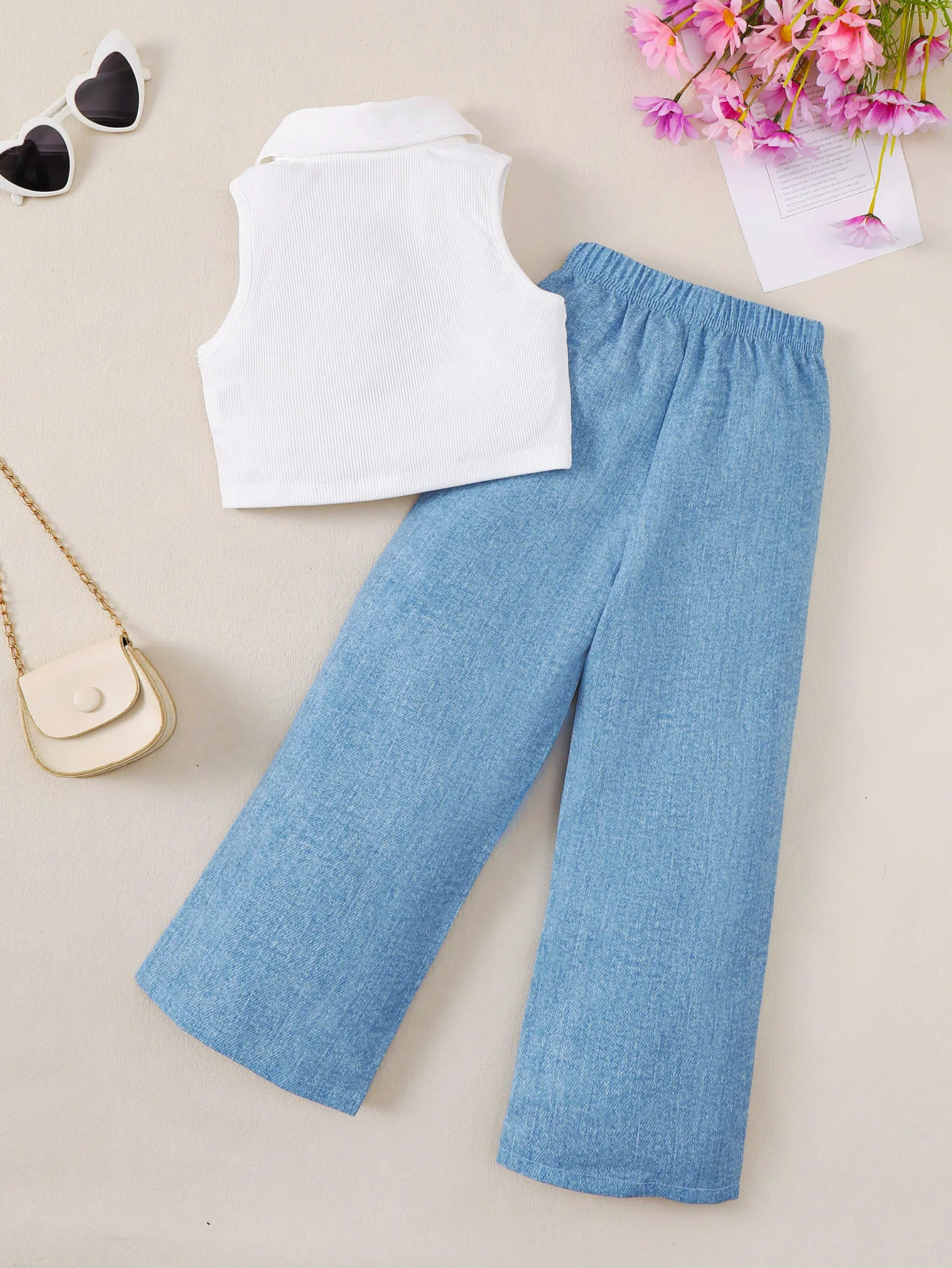 Young Girls' Solid Color Casual Tank Top With Denim Look Floral Print Straight Pants, Summer